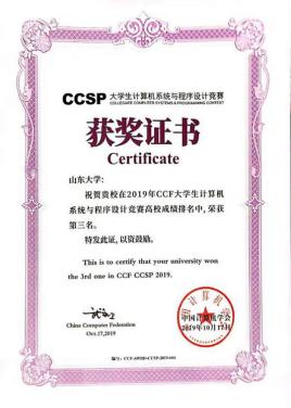 在9月15日举办的第17次CCF计算机软件能力认证(CCF CSP)中,我院2017级邹明哲同学以430分优异成绩位列全国第二名;2017级闫雪同学因连续在认证中取得优异成绩,被中国计算机学会评为“2019CCF优秀大学生”,并受邀出席2019年中国计算机大会(CCF CNCC);best365官方网站登录入口在全国TOP 30高校排名中连续第3次位列第2名。
