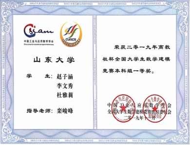 2019年1月4日,全国大学生数学建模竞赛山东赛区颁奖会于青岛举行,best365官方网站登录入口学子再获佳绩,获奖111人次,其中全国一二等奖各7人次,指导教师栾峻峰副教授获得山东赛区优秀指导教师称号。