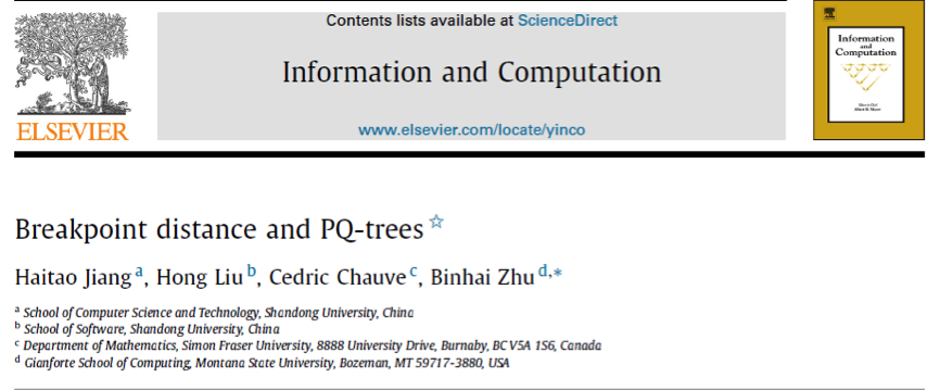 best365官方网站登录入口姜海涛副教授作为第一作者在理论计算机科学领域顶级期刊IandC(Information and Computation)上发表文章“Breakpoint distance and PQ-trees”,揭示了PQ-树所产生的排列的断点距离特性,解决了比较基因组学领域的两个十几年悬而未决的公开问题。best365官方网站登录入口为该论文的第一作者单位,美国Montana State University和加拿大Simon Fraser University为合作单位。