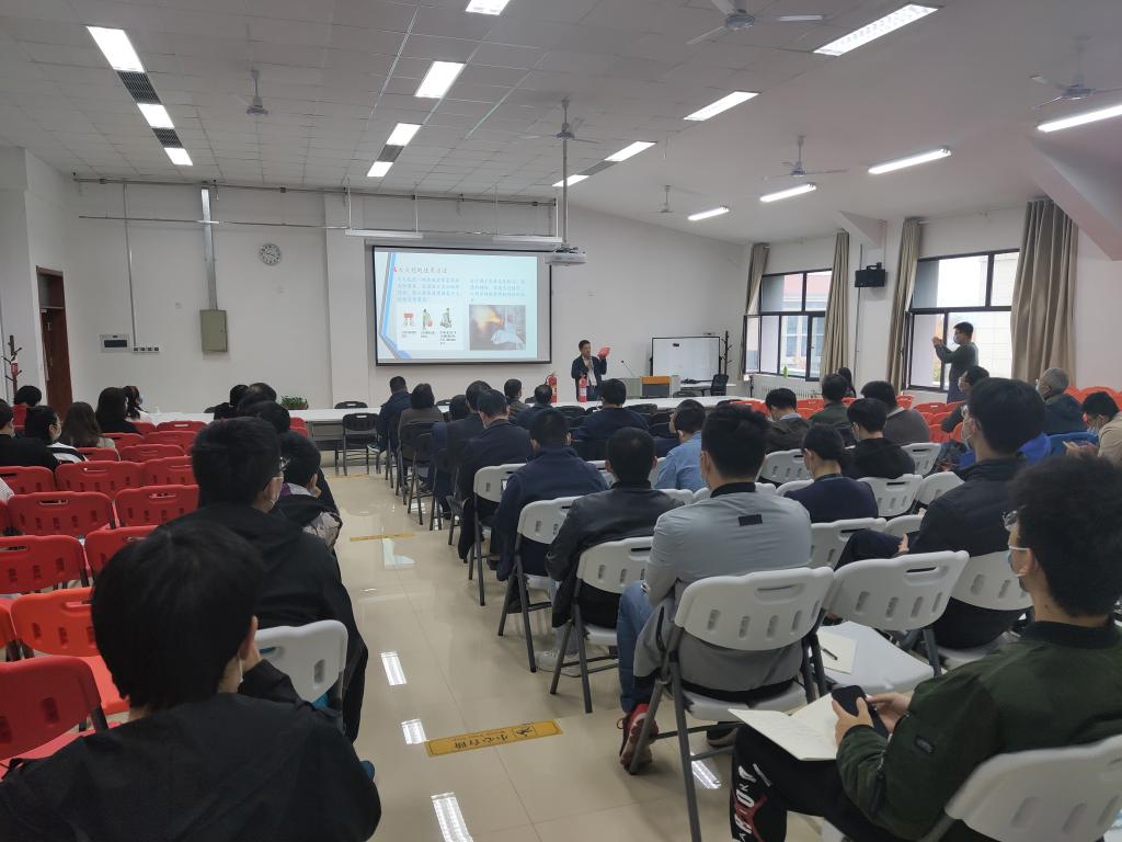 孙垚老师首先结合近年来几例高校实验室火灾安全事故,提醒与会师生要坚决克服麻痹侥幸心理,在日常工作学习中不断增强自防自救能力;接下来,他详细介绍了消防器材的使用方法、火场逃生技巧、消防法律法规等消防相关知识,讲解了灭火步骤和安全有效的逃生方法,提醒大家关注所在场所的疏散路线图,希望全体师生建立起火灾情形下灭火、逃生、自救的快速反应能力;最后,在讲座现场演示了灭火器、消防面具以及灭火毯的使用方法。
