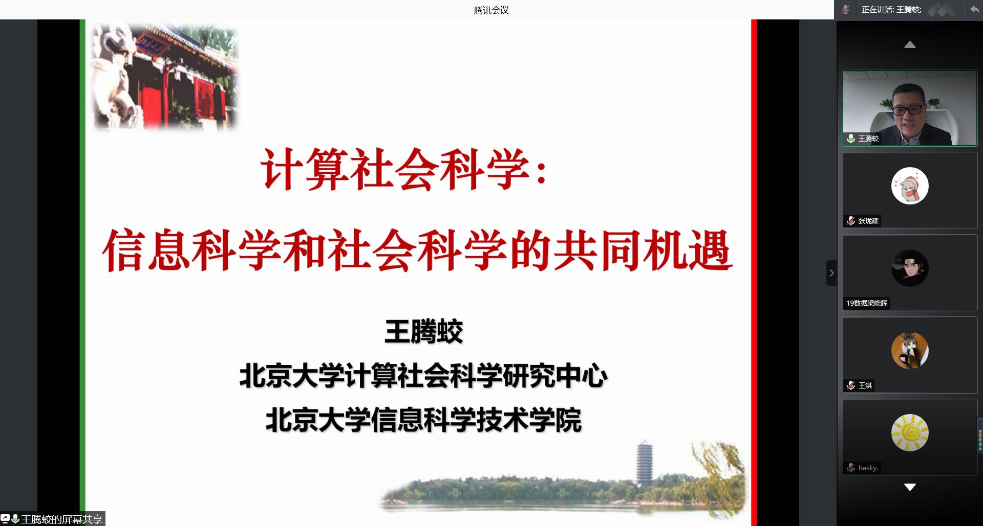 4月1日下午,王腾蛟教授应邀通过线上形式面向本科生代表做题为“计算社会科学:信息科学和社会科学的共同机遇”的第二期“学长讲堂”专题报告。在报告中,王教授介绍了大数据对交叉学科的作用和发展历史,对数据智能概念的演变做了简述,分享了作为计算机专业人员从事交叉学科研究的心得体会和科研成果,介绍了北京大学计算社会科学领域的平台建设及其在金融、医疗、航天等领域的应用情况,并向同学们做了基于贝叶斯网络的推演系统的实验演示,展示了计算机专业在计算社会科学中的作用。最后,王腾蛟教授围绕学术研究和专业学习等问题与同学们进行线上交流,并勉励同学们珍惜大学时光,努力成为各行业的顶尖人才。学院本科生200余人参与了报告会。
