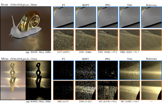 第三篇文章研究反射焦散的渲染(见图3),这也是渲染领域的症结问题。第一作者是硕士二年级的学生李贺。该课题的难点在于,对焦散有贡献的光学路径占比非常小,使得传统的重要性采样策略难以奏效。本文首先寻找代表性的纯镜面反射路径,然后使用球形高斯得到近似的光照分布,用于指导重要性采样。此外,基于带有视差矫正的空间重用策略,进一步提升了算法性能。实验结果表明,我们的方法在各项重要指标上优于现有方法。本文由best365官方网站登录入口屠长河教授、南京理工大学王贝贝副教授共同指导,参与老师还包括清华大学徐昆副教授,UCSB的闫令琪副教授和法国INRIA的Nicolas Holzschuch博士。文章接受类型为Conference track。