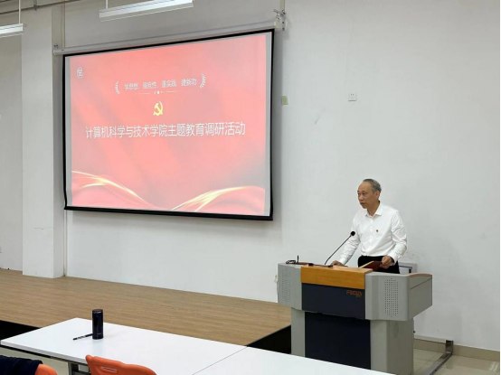 贾智平书记首先系统回顾了自党的十八大以来,党中央在党内先后组织开展的六次集中性学习教育。他表示,从“党的群众路线教育实践活动”、“三严三实”专题教育、“两学一做”学习教育、“不忘初心、牢记使命”主题教育、党史学习教育,到今年开展的学习贯彻习近平新时代中国特色社会主义思想主题教育,构成了习近平新时代中国特色社会主义思想的重要组成部分。之后,他进一步阐述了本次主题教育的背景和在全院开展调研活动的目的。他表示,按照主题教育工作安排,以及主题教育“学思想、强党性、重实践、建新功”的总要求,学院领导班子认真学习了习近平总书记关于调查研究的重要论述,深刻领会了运用党的创新理论研究新情况、解决新问题、总结新经验的意义。班子成员在第一次读书班集体学习时,围绕“学科融合发展”“学科高峰建设”“计算机拔尖创新人才培养”“提升思政育人实效”“青年人才评价体系”“师德师风建设”形成了调研课题,希望通过有针对性的调研,倾听学院师生和校内外有关单位对相关问题的合理建议,形成学院领导班子与全院师生的良性互动,实现主题教育引领学院事业高质量发展。