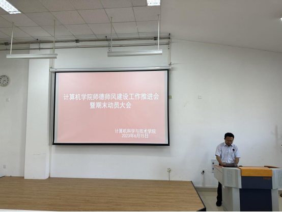 陈竹敏副院长代表学院党委就学院师德师风建设做重点工作部署。他传达了教育部近期召开的“师德师风建设工作推进暨师德集中学习教育启动部署会”会议精神,通报了教育部发布的违反高校教师职业行为十项准则部分典型案例,并就学校即将面向全校教职员工开展的师德集中培训进行介绍并提出具体要求。他表示,教师是立教之本、兴教之源,肩负着为党育人、为国育才使命,良好的师德师风对立德树人根本任务起到推动和保障作用。学院党委高度重视教师思想政治工作,将结合学习贯彻习近平新时代中国特色社会主义思想主题教育,按照师德师风建设的新形势新要求做好接下来学习教育工作。希望学院全体教职员工切实增强为国育贤的责任感、使命感和紧迫感,各教工党支部切实发挥好战斗堡垒作用,全院领导班子成员也将针对所辖工作领域内事关教师师德师风的相关工作加强政治把关,从细处入手、实处发力,共同将师德师风工作做细落实,形成强大工作合力,探索并构建出具有计算机学科特色的制度化、规范化、品牌化的师德师风建设格局。