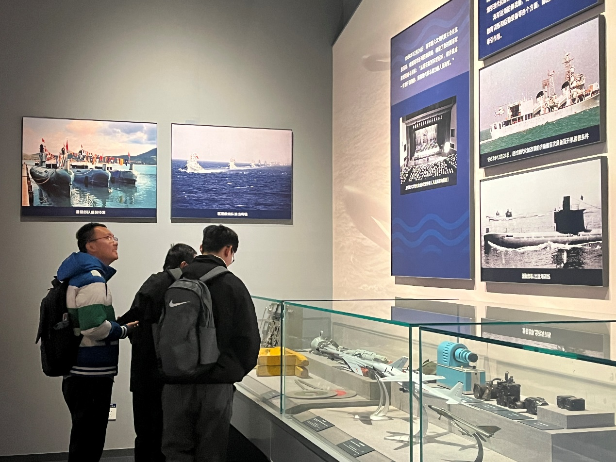 中国人民解放军海军博物馆共有三个展区:室内主展馆、陆上装备展区和海上舰艇展区。同学们首先参观了室内主展馆。主展馆设有四个展厅,详细展示了我国人民海军的发展历史,系统展现了在党的领导下人民海军取得的历史性成就、发生的历史性变革。在陆上装备展区,可以目睹万山海战中荣立集体大功的解放号功勋艇炮艇、人民海军第一次海上大阅兵时周总理乘坐的荣誉艇-245号木壳鱼雷快艇,以及参加过援越抗美防空作战的功勋炮等具有重大意义的海军武器装备。