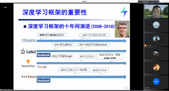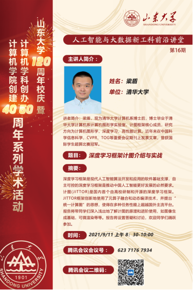 2021年9月11日,第十六期人工智能与大数据新工科前沿讲堂在腾讯会议线上直播平台举办。本次讲座邀请了清华大学博士后,计图框架核心成员梁盾博士,为学院师生做了题为“深度学习框架计图介绍与实战”的报告,并于报告后与老师同学们进行了热烈地交流,吕琳教授主持了本次报告。