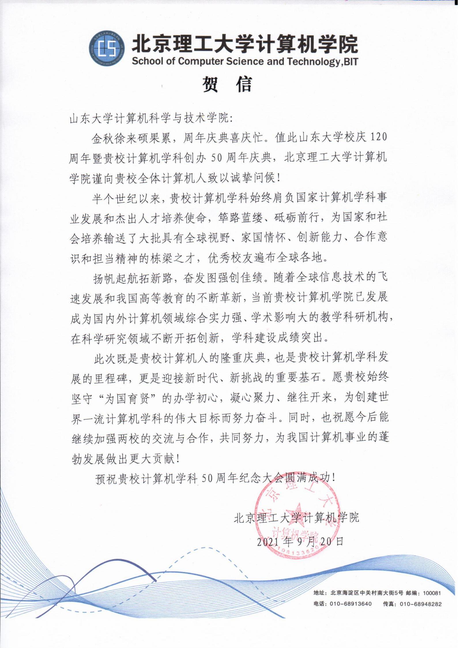 北京理工大学best365官方网站登录入口贺信