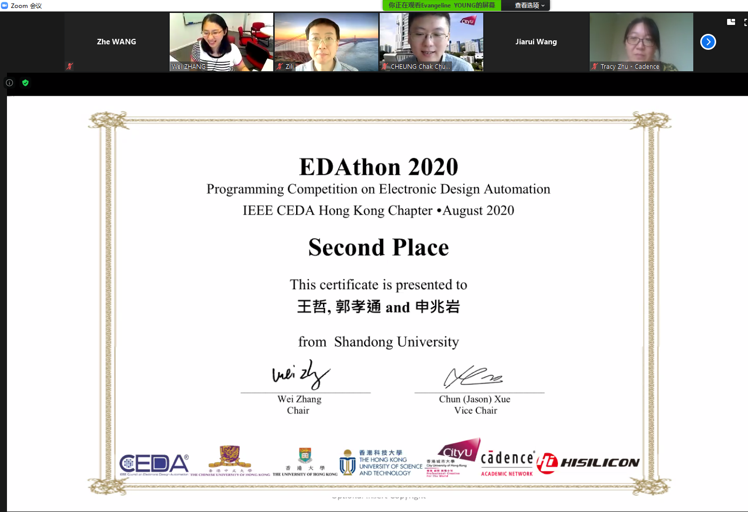2020年8月7日,由IEEE电子设计自动化委员会(Council on Electronic Design Automation, CEDA)主办的第五届电子设计自动化(Electronic Design Automation, EDA)马拉松编程大赛EDAthon在香港科技大学落下帷幕。best365官方网站登录入口体系结构与嵌入式研究中心申兆岩老师指导的由2019级研究生郭孝通和王哲组成的队伍最终总分排名第三,成绩紧随清华大学、北京大学,最终与北京大学共同荣获二等奖。